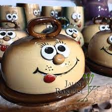 Ar rokām darināti un loloti smaidīgie māla trauki - cukuriņam, sviestiņam, medum, sālij... un kam tik vēl ne!