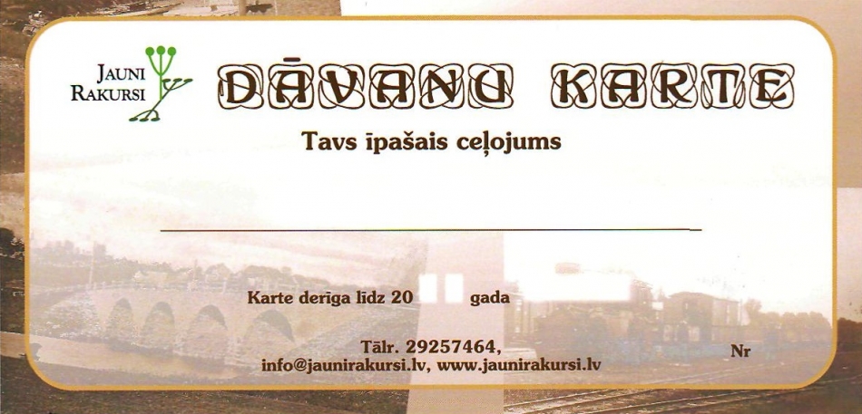 - "Jauni Rakursi" Īpašā klienta kartes īpašniekiem piedāvājam 10% atlaidi! Īpašā klienta karti vari iegūt, ja kalendārā gada laikā esi devies vismaz desmit mūsu organizētajos braucienos. Lai saņemtu Īpašā klienta karti, lūdzam uzrādīt apmaksas dokumentus (kvītis, maksājuma izdrukas) par vismaz desmit ekskursijām kalendārā gada laikā uz Jūsu vārda.